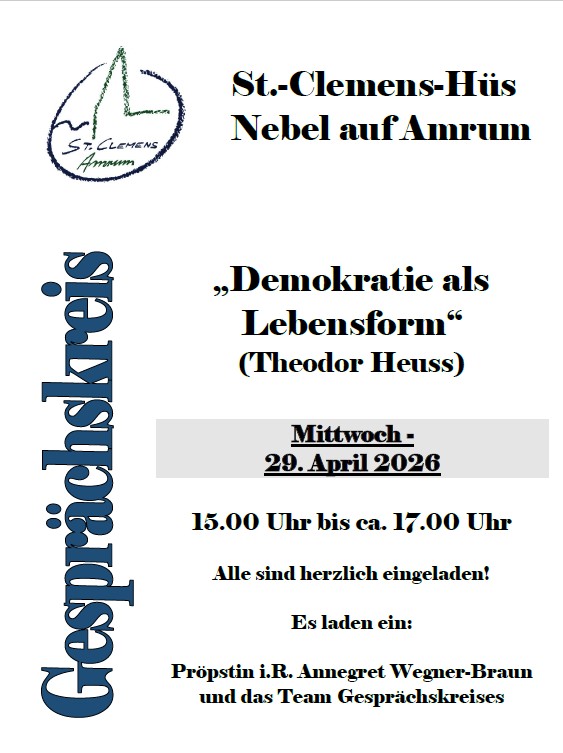Jeden Sonntag feiern wir um 10 Uhr gemeinsam Gottesdienst in der Kirche St. Clemens in Nebel. Kommen Sie gerne dazu. Zu Ihrem eigenen Schutz sind Sie eingeladen, beim Singen einen Mund-Nasen Schutz zu tragen.