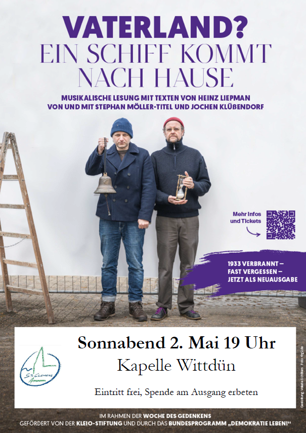 In seinem Buch erzählt Liepman die berührende Geschichte der Mannschaft des Fischkutters „Kulm“, die im Frühjahr 1933 nach drei Monaten auf See, ohne Funkkontakt oder einen Hafen angelaufen zu haben, in ein auf schreckliche Weise verändertes Hamburg zurückkehrt. Die Schauspieler und Musiker Stephan Möller-Titel und Jochen Klüßendorf erzählen diese Geschichte – mit viel Hamburger Lokalkolorit und trotz allem nicht ohne Humor: „Wir kennen alle Orte, an denen die Geschichte spielt und haben eine persönliche Vorliebe für die Sehnsucht der Seeleute nach dem Meer und der Heimat. Aber wir haben keine persönlichen Erfahrungen mit Verfolgung, Diskriminierung und Berufsverbot. Allenfalls eine vage Vorstellung, wie wir uns selbst angesichts von Grausamkeit und Unmenschlichkeit verhalten würden. Deshalb gehen wir vorsichtig auf diese vergessene Geschichte zu. Aber eine erst verbotene und dann vergessene Geschichte zu erzählen kann nicht verkehrt sein und zur Sicherheit haben wir auch diesmal wieder unsere Instrumente mit an Bord.“